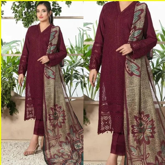 ZAINAB CHOTANI-3PC CHIKENKARI LAWN EMBROIDERED SHIRT WITH MONARK PRINT DUPATTA & TROUSER-ADR-4052 MEHROON